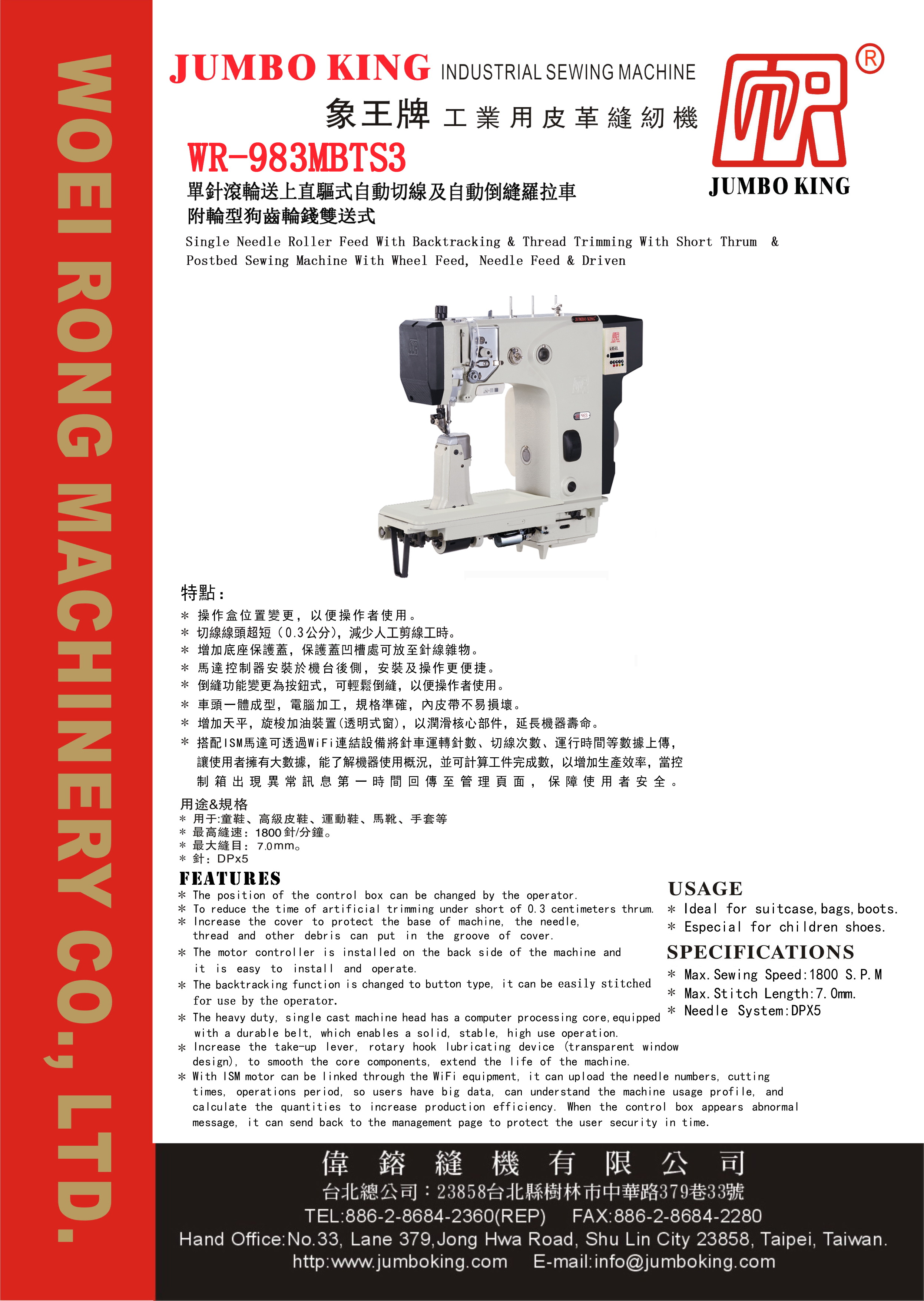 Our company’s parent company—Woei Rong Sewing Machine Co., Ltd. was founded in Taipei, Taiwan and has branches at Tai Chung in Taiwan, Ningbo and Guangdong in Chinese Mainland, Hong Kong, and Vietnam. Woei Rong Sewing Machine Co., Ltd. is the manufacturer of Jumbo King” brands Industrial sewing machines. Its chairman Chen, Jui-wen has been engaged in research, development and manufacturing of Industrial sewing machines for more than 30 years.
